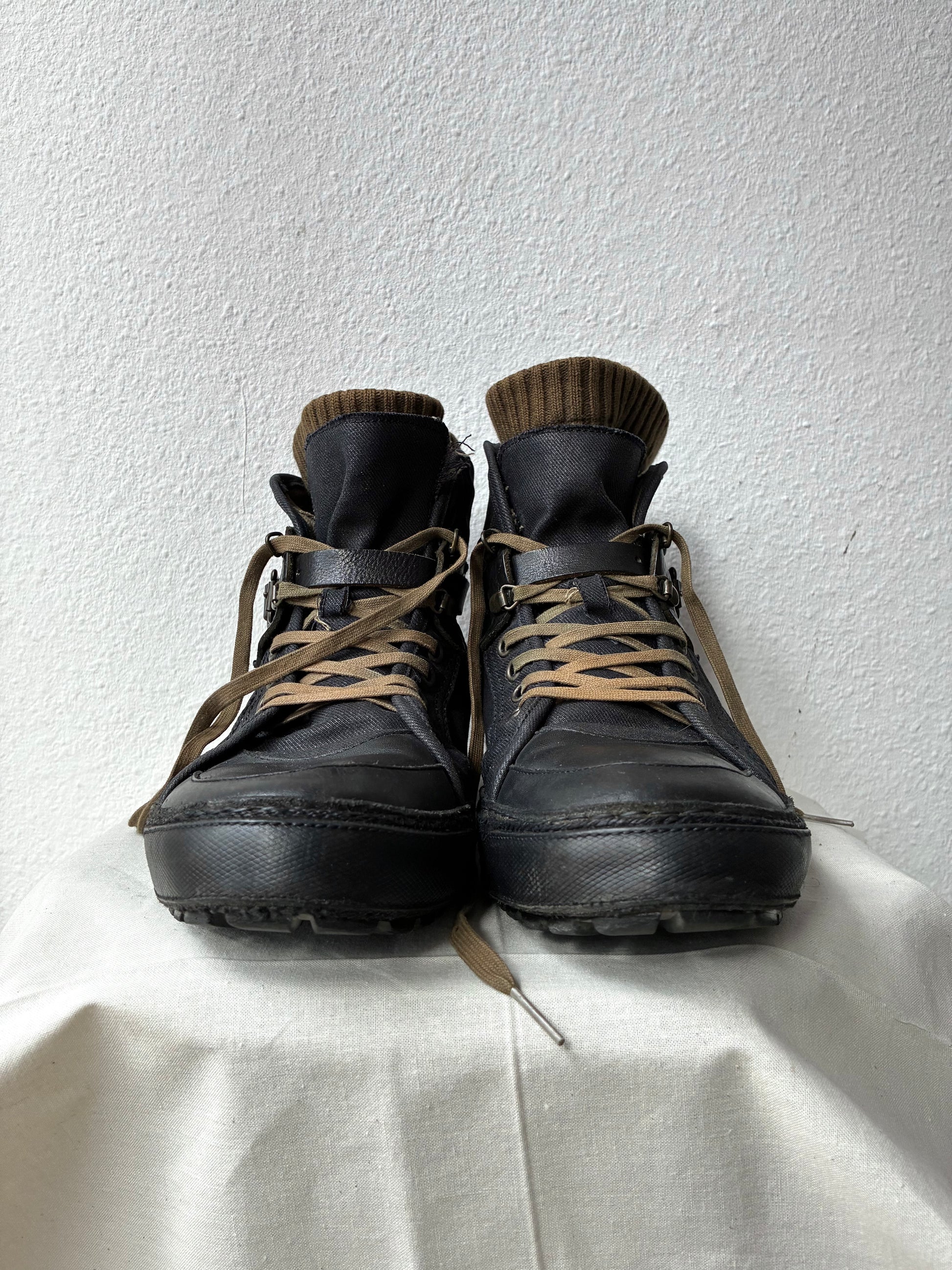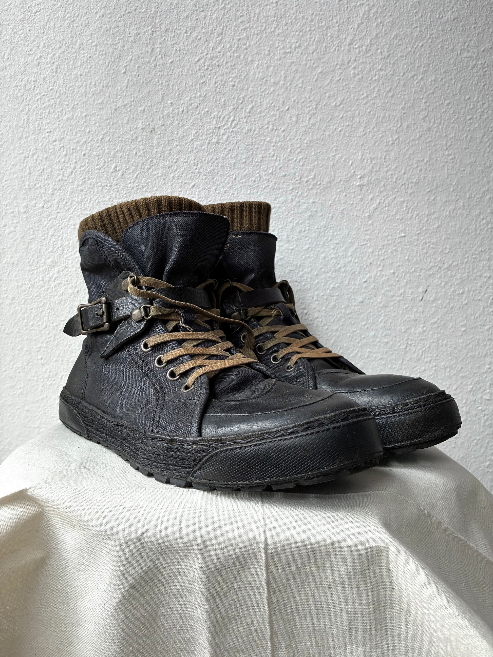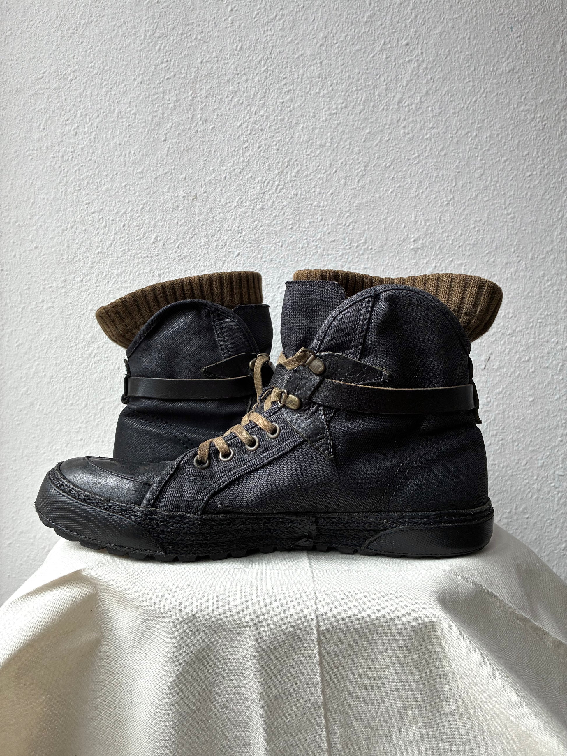 Made of thick waxed canvas. Leather buckle and toe cap. Sole made of rope + leather pads.