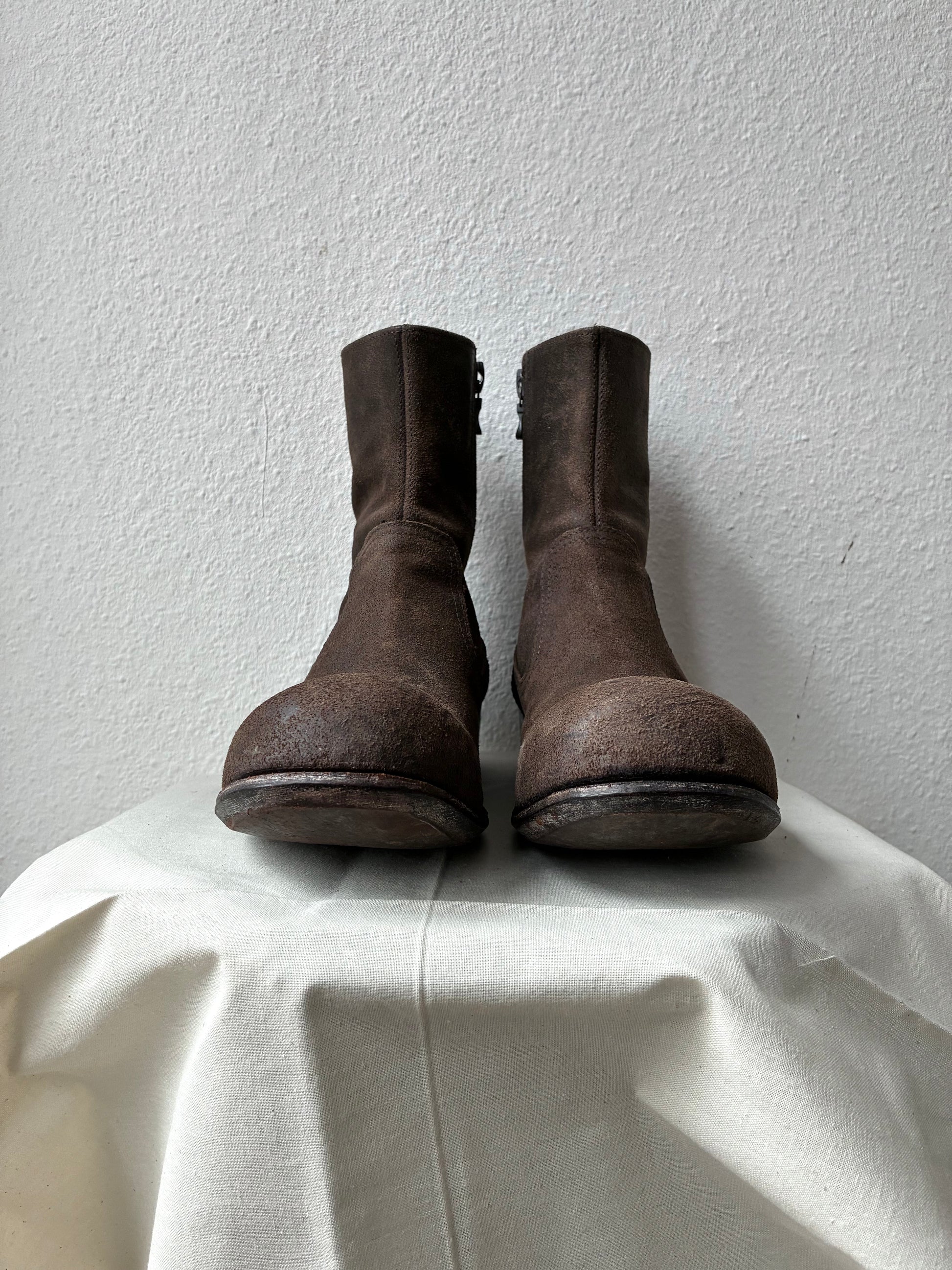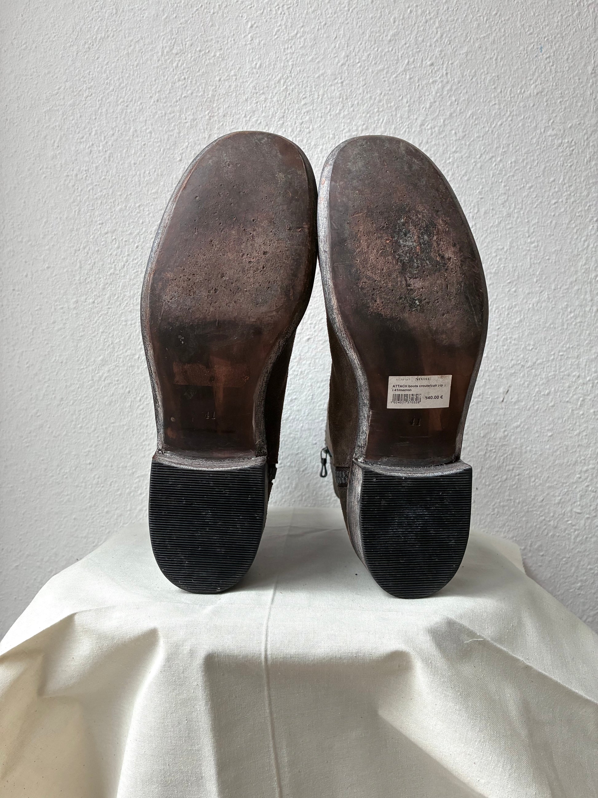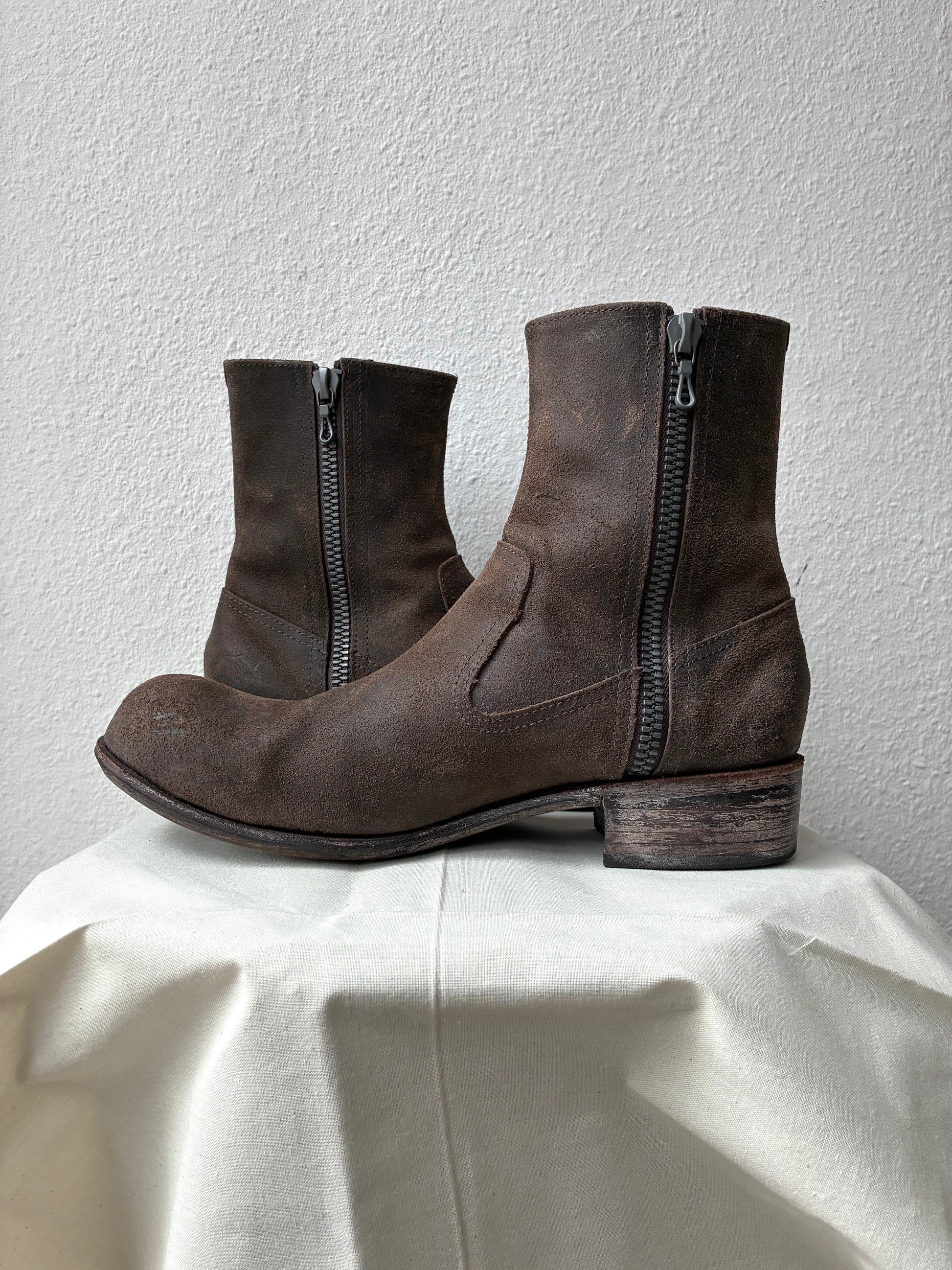 Amazing quality on this pair. Outshell made of split leather that will age and texture nicely. Boots are lined with soft leather for comfort and durability. Aged wooden soles. Riri zippers.