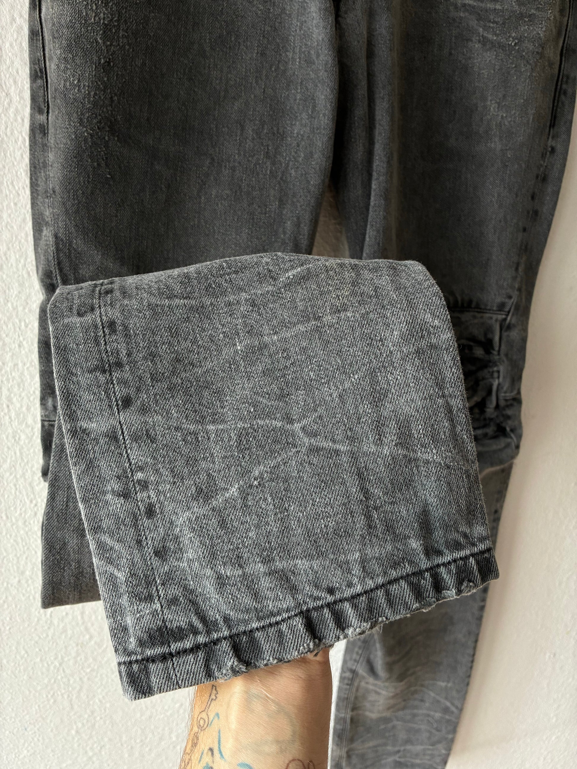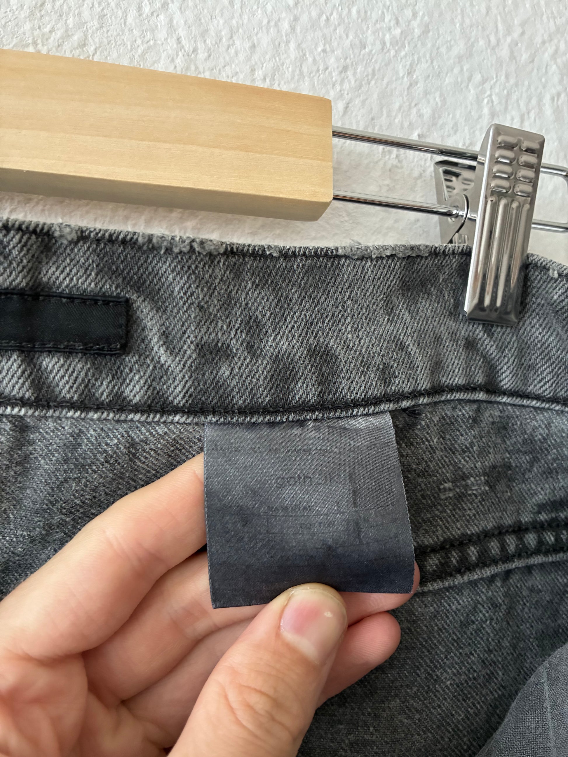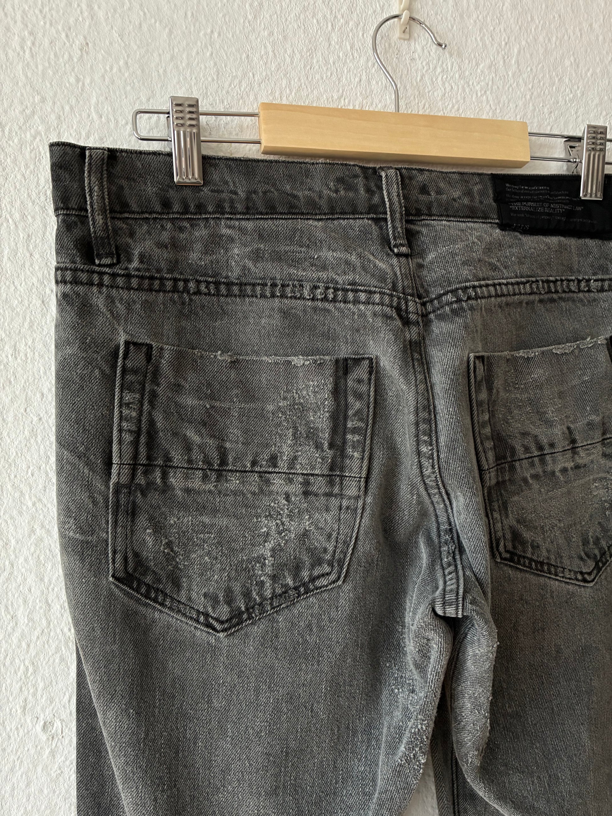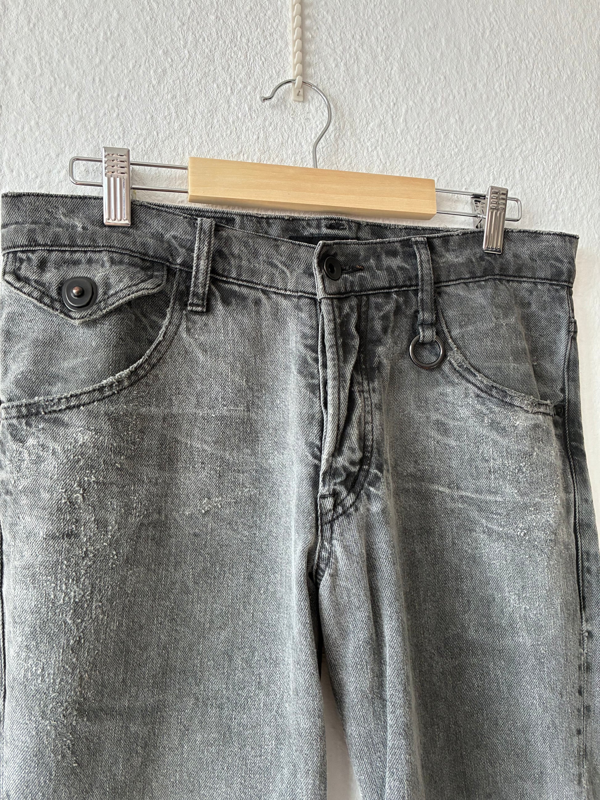 Amazing details. Lots of distressings and fabulous wash. Made of very thick denim. Gas mask button. Chain ring. Extra long inseam for stacking.