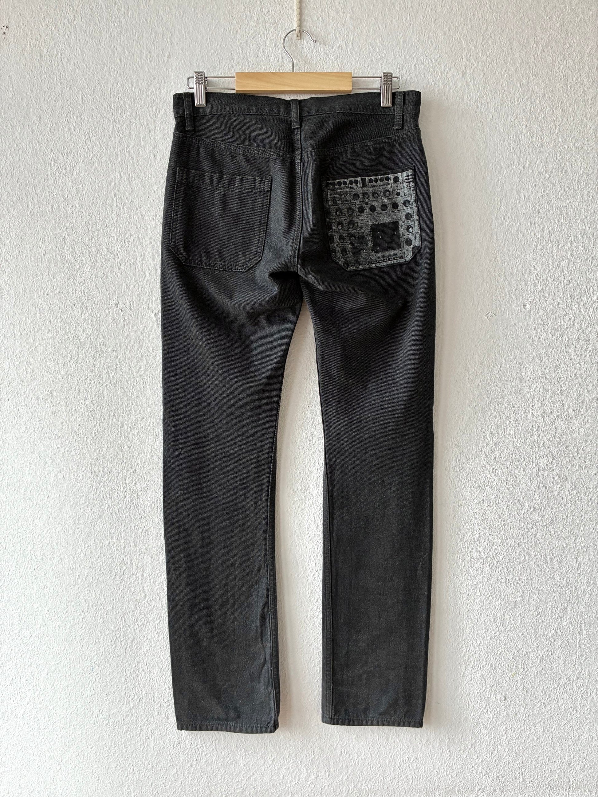 Selvedge denim. Music hardware print. Patti Smith thunder embroidery. Slim straight cut.